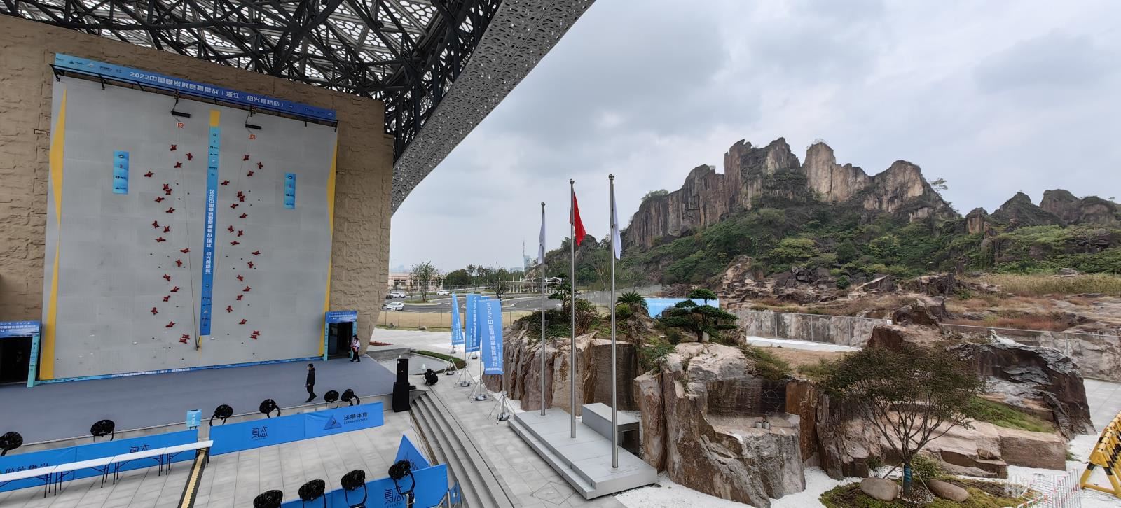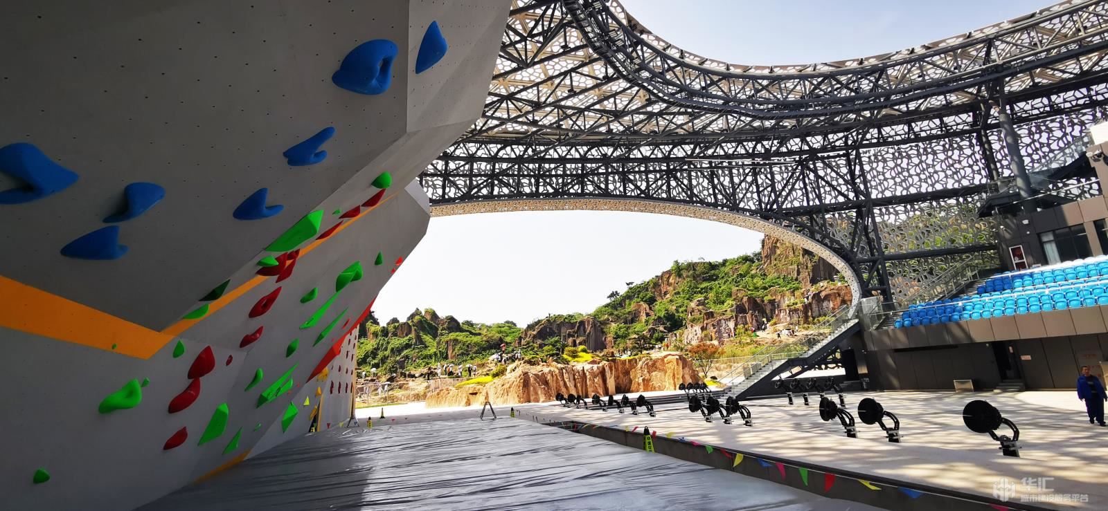 踏入場館,遠(yuǎn)遠(yuǎn)望去,整個場館呈“蠶繭”形,場館屋頂除了滿足攀巖比賽遮蓋要求,盡最大可能開啟了天空與景觀,2000年《西游記》第九集《祈雨鳳仙郡》拍攝取景的羊山石城景區(qū)成為了場館最美的背景映襯。